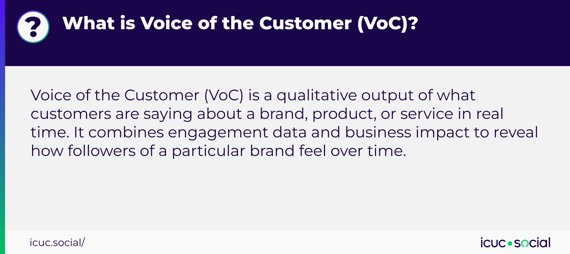 Voice of the Customer is a qualitative output of what customers are saying about a brand, product, or service in real time. VoC is helpful because it combines engagement data with business impact to reveal how followers or fans of a particular brand feel over time.